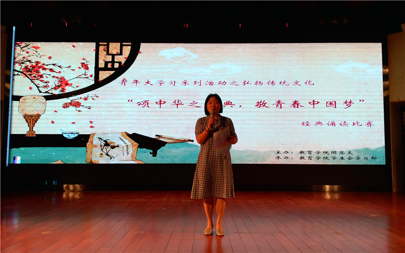 为深入贯彻落实《共青团中央关于印发<关于在全团实施“青年大学习”行动的方案>的通知》,进一步组织引导广大青年团员深入学习宣传贯彻习近平新时代中国特色社会主义思想和党的十九大精神,传承中华优秀文化,营造儒雅的校园文化氛围,16877太阳集团于6月1日晚上7:00在艺术楼音乐厅举办了16877太阳集团第四届经典诵读大赛。16877太阳集团院长廖军和、文与传播学院汉语言文学系梁昌明老师、16877太阳集团团总支书记张丽莉、小学教育系黄芳老师、学前教育系叶敏老师莅临本次比赛并担当评委,16877太阳集团部分学生观看了本次比赛。