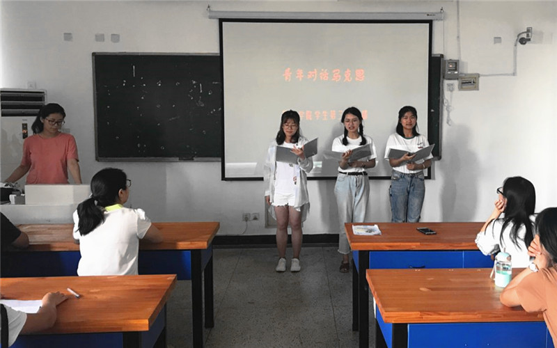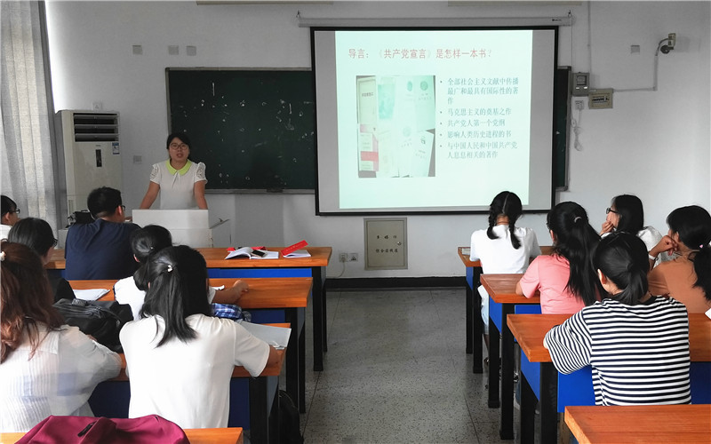 本次活动共分为三个流程。首先由青年代表黄雪晴、杨若麟和秦睿朗读《共产党宣言》的引言部分,一字一句,铿锵有力;接着由主持人播放由团支书和入党积极分子共同拍摄的以“你对马克思有什么印象、你想对马克思说什么和当代青年要怎么做”三个问题为主题的短片,充分表达了同学们对马克思崇高的敬意;然后由杜文玲老师给大家讲述《共产党宣言》的相关内容。首先她指出学习《共产党宣言》的重要性并强调要重视对意识形态的学习,其次从写作背景、主要内容和现实意义三个方面介绍了《共产党宣言》,然后给予同学们以寄语,希望同学们能毫不动摇的坚持和发展马克思主义;最后由主持人宣布活动结束。