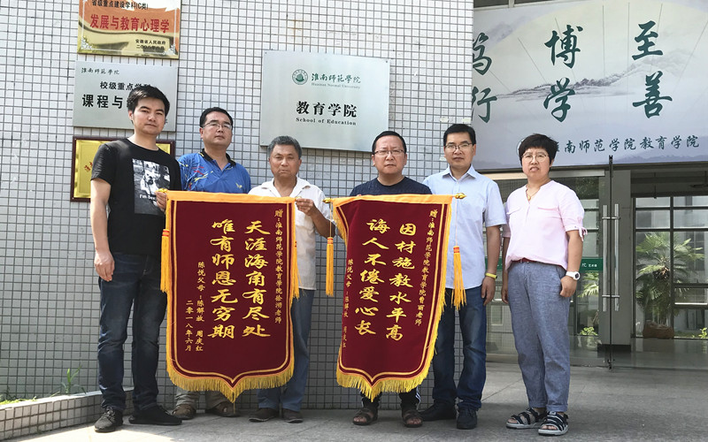 大病初愈,陈悦同学和父亲制作了两面锦旗,回到学校来当面对两位老师提供的帮助进行感谢,“天涯海角有尽处,唯有师恩无穷期”;“因材施教水平高,诲人不倦爱心长”,浓浓的感激之情溢满两面锦旗。