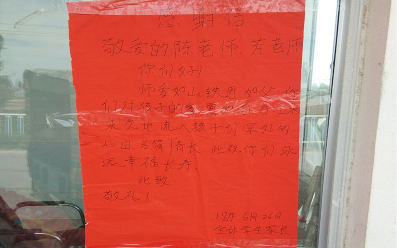 2018626日,阜阳市颍泉区姜堂中心学校椿树小学将一面印有“爱心奉献,良师益友”的锦旗送到即将结束支教回校考试的16877太阳集团2015级小学教育专业学生陈刚手上,学生家长们自发张贴了感谢信,感谢他支教期间所做的贡献。阜阳市颍泉区姜堂中心学校椿树小学给16877太阳集团发来题为《‘爱心奉献,良师益友’——记在三尺讲台挥洒汗水的支教大学生—陈刚》的表扬文稿。