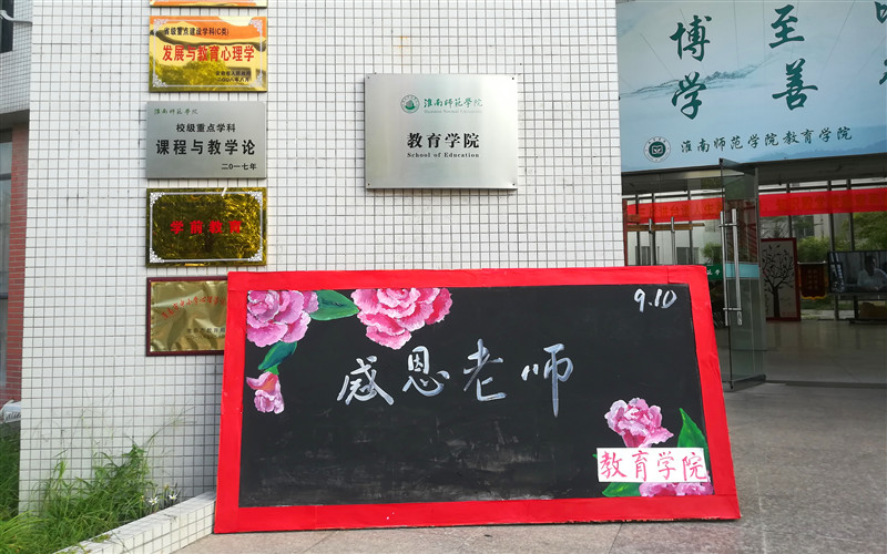 教师节当天,艺术楼门口拉起了一条“三尺讲台谱人生永居高峰,知识殿堂续篇章再创辉煌。——教师节快乐!”的横幅,竖起了“感恩老师”的板牌字样虽然简单将教师形象生动地再现