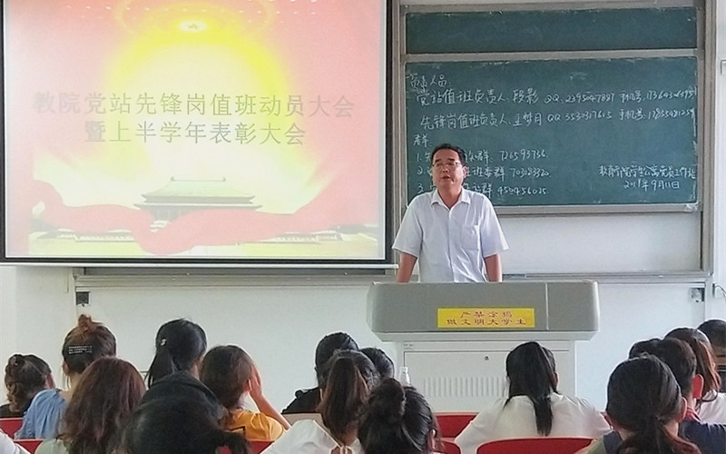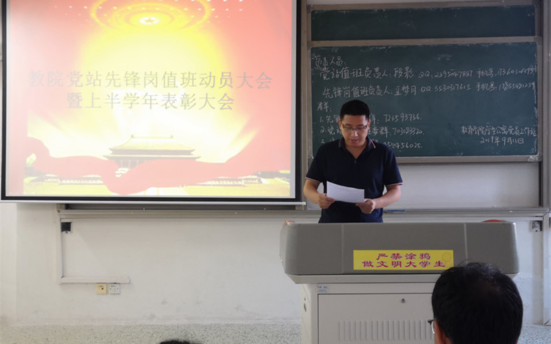 为了提高我院学生党员、入党积极分子的党员意识和先锋岗值班的质量,更好地发挥先锋模范带头作用,16877太阳集团学生公寓党员工作站于2019911日下午4:30在泉教A-201召开2018-2019学年(下)表彰大会暨2019-2020学年党站工作、先锋岗值班动员大会。大会由16877太阳集团学生公寓党员工作站站长刘方主持,16877太阳集团分党委书记孙振、副书记孙宏新、党站指导老师杜文玲出席大会。16877太阳集团全体学生党员、重点培养发展对象、入党积极分子及站委会全体成员参加会议。