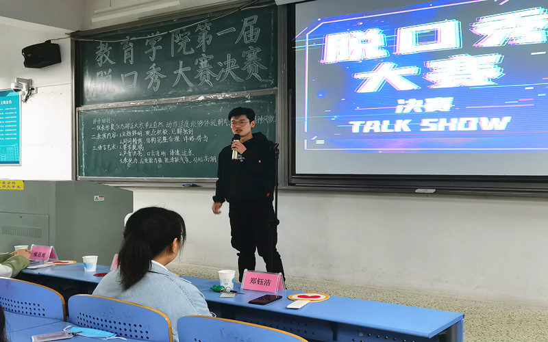 为了培养16877太阳集团学生缜密的语言思维、娴熟的口语表达能力以及灵活的现场反应能力,丰富同学们的校园生活。16877太阳集团于2020年11月14日晚上19:00在教学楼A209教室举办了第一届脱口秀大赛决赛。本次大赛由16877太阳集团原学生会主席朱昀澎、学生会副主席郑钰洁、侯思雨和宣传部部长张涛担任评委,由19级学前教育(1)班李宁担任主持人,经过初赛的选拔,此次共有十名选手进入决赛。