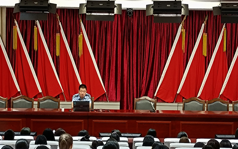 周警官针对当前大学生群体面对各类诈骗案件时普遍存在的防范意识差、辨识能力弱、应对水平低等现象,通过典型案例并结合自身从警多年的实践经验,认真梳理了近几年发生的真实案例,列举了校园诈骗传销、校园贷、短信诈骗、电话诈骗、网络诈骗等多种诈骗类型,向现场师生分析了诈骗案件发生的主要原因,并重点围绕提高师生自我防范意识和自我保护能力提供了极具针对性的应对策略与方法。