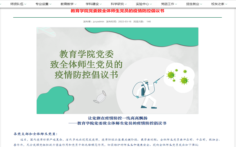 围绕“疫情防控”这一重中之重的任务,学院召开党委会、党政联席会议专题研究疫情防控措施,召开教师大会、纪委会、学生工作专题会、主题班会、印发倡议书等形式传达疫情防控精神,布置具体工作,构建其横向到边,纵向到底的责任体系。并要求学院各级党组织和师生党员要切实提高政治站位,增强政治意识,充分认识当前疫情防控斗争的严峻性、复杂性和紧迫性,坚决克服麻痹思想、侥幸心理和松懈心态,把抓好疫情防控工作作为当前头等大事,在做好疫情防控工作中践行初心使命、体现责任担当,不折不扣落实好上级各项疫情防控措施,“看好自己的门、管好自己的人“,坚决有效阻断疫情输入传播,构筑疫情防控坚强屏障。