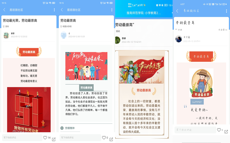 开展“劳动最美丽”线上主题分享活动。学院充分利用易班、微信、微博、抖音、哔哩哔哩等互联网技术应用,以“劳动最美丽”为主题,通过分享自己在劳动中的所思所想所感、分享劳动成果和劳动先进典型等形式弘扬劳动精神。