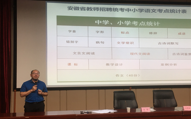 讲座中,安徽好学教育信息科技公司总经理王芳友,利用大量数据,结合成功案例,围绕小学语文、数学学科招考数据、考试形式、内容、如何备考、资料准备等方面内容进行讲解。他用深入浅出、幽默风趣的讲解形式,帮助同学们掌握报考政策、备考方向和笔面试技巧,指导同学们做好备考规划,合理选择区域岗位。最后,王老师就同学们提出的各类问题进行了细致、耐心的交流与讲解。