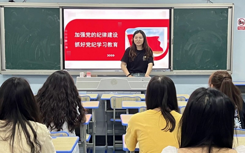 汪静主要围绕加强党的纪律建设,抓好党纪学习教育的背景意义、主要内容以及路径方法三个方面进行讲述。最后她强调党的纪律是管党治党的“戒尺”,也是维系党组织稳定和执政合法性的重要保障。在新时代新征程上,广大党员要主动学纪、知纪、明纪、守纪,不断增强纪律意识,守住纪律底线,提升党性修养,发挥好学生党员的模范带头作用。